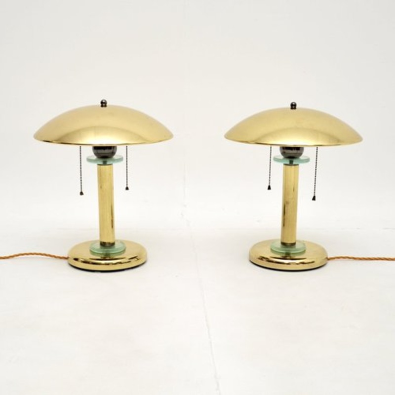 A stunning pair of vintage brass and glass table lamps, made in France and dating from around the 1970s.They are of superb quality, in the classic Art Deco style. They have a mushroom shaped design, with beautiful glass accents at the bases and under the t