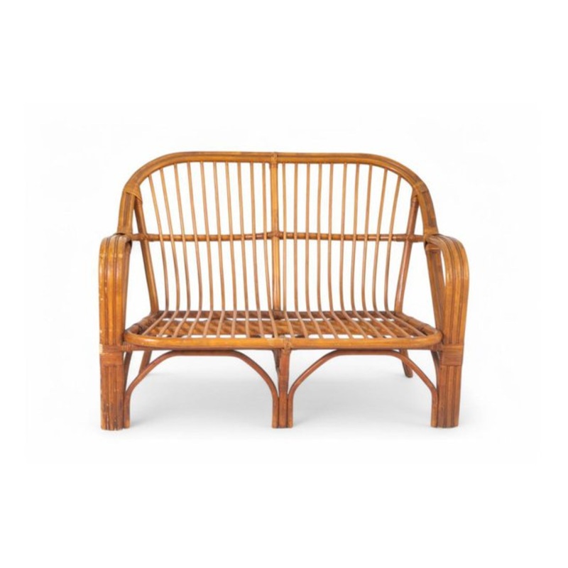 Bring a touch of natural warmth to your home with this stunning vintage rattan loveseat, perfect for creating a cozy and relaxed atmosphere. Handwoven to enhance the beauty of natural fibers, this two-seater sofa features light lines and a solid yet airy structure, characteristic of mid-century and boho chic style. The harmonious curves of the backrest and armrests ensure optimal comfort, while the honey-toned rattan adds a timeless charm. Ideal for a reading nook, a veranda, or a naturally styled living room, it can be easily personalized with soft cushions for an even cozier touch. A unique and timeless piece, perfect for lovers of vintage design and high-quality craftsmanship.