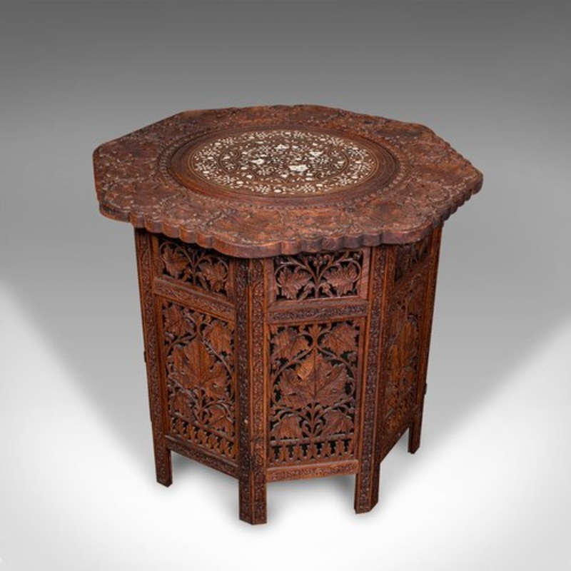 This is a vintage campaign tea table. A Burmese, carved teak decorative fold away display or lamp table, dating to the late Art Deco period, circa 1940.Fine, solid example with a delightful inlaid appearanceDisplays a desirable aged patina and in good orde