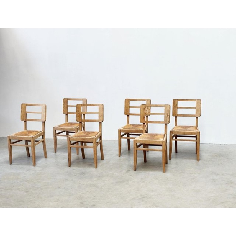 Elevate your dining space with this exclusive set of six mid-century chairs by Pierre Cruge, featuring stylized eight-shaped backs and airy webbed seats. Expertly crafted with high-quality joinery, the fully sandblasted wooden frames reveal the natural hues of the wood, enhancing every detail. Textured rush seats add a layer of comfort and tactile warmth, perfectly complementing the chairs’ organic design. A true testament to post-war French craftsmanship, these chairs blend rustic charm with modern functionality for a standout dining experience.