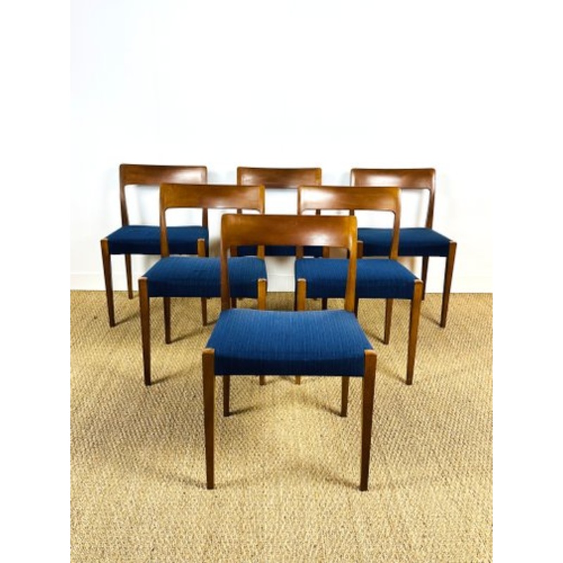 Six vintage teak chairs dating from the sixties signed G-Plan. Teak structure and blue fabric seat. The chairs show slight signs of wear (see photo). Good general condition. Dimensions: H74 HA44 L48 P47 Manufacturer G-Plan Design Period 1960 to 1969 Produc