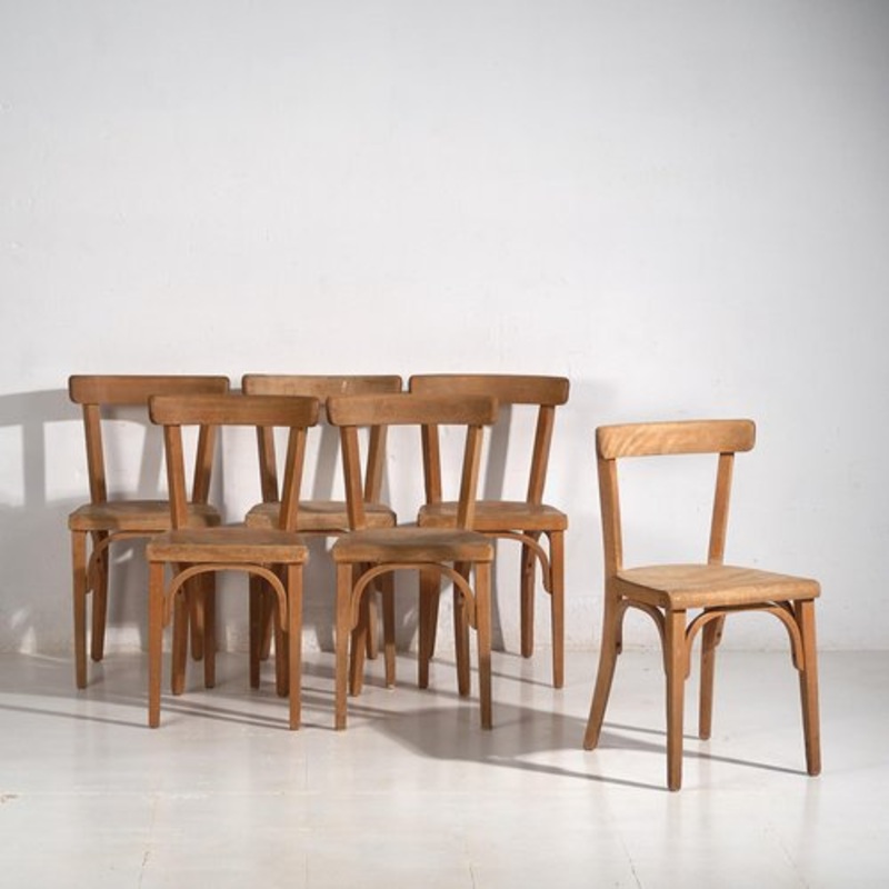 Thonet vintage wooden chairs. Set of six pieces (c.1940). Dimensions: Width: 39 cm Depth: 41 cm Height: 80 cm Seat: 46 cm Style: Mid 20th century modern Materials and techniques: Beech, curved wood Place of origin: Central Europe Epoch: Mid-20th century Date of manufacture: Circa 1940 Condition: Good. Wear consistent with age and use. Our vintage wooden Thonet chairs are unique pieces that stand out for: Its elegant curved wood. The woodworking technique was innovative at the time and allowed the creation of soft and round shapes with manufacturing processes based on the quality and good selection of its woods. Maintain the original THONET seal of manufacture Its versatile and timeless style can be the perfect complement to a dining table, living room or any contemporary space. The state of conservation is optimal, except for the characteristic imperfections of any antique furniture due to the course of the years. Give a point of originality to your home with these unique pieces, which merge with the contemporary style bringing personality to your home.