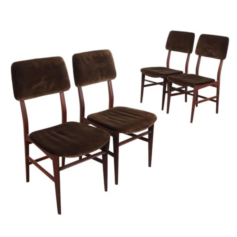 Four chairs in stained beech wood, seat and back with foam padding and fabric upholstery in the original brown tones of the period. Manufacturer Dassi Design Period 1960 to 1969 Production Period Unknown Country of Manufacture Italy Identifying Marks This