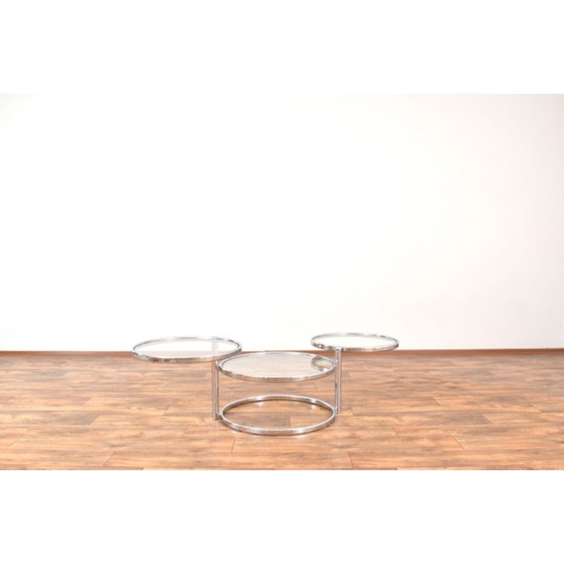 This coffee table was manufactured in Germany in the 70s. The style of the furniture refers to the design of the famous American designer Milo Baughman. The frame of the table is made of chrome-plated steel, and the tops are made of glass. The table is in good condition with traces of use in the form of slight abrasions and scratches.