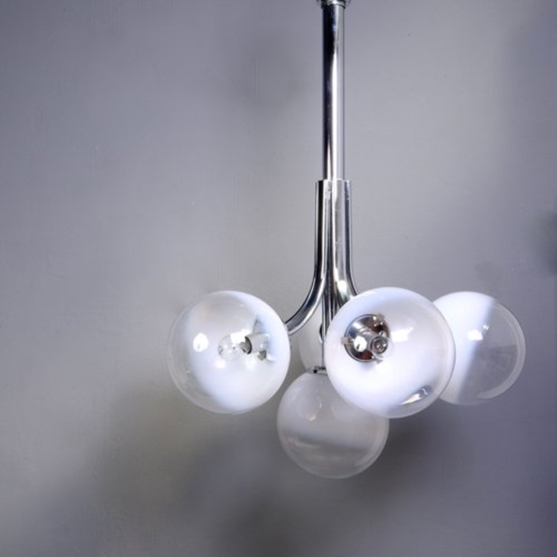 Beautiful vintage suspension chandelier, 1970s made in Italy, composed of 6 Murano glass bowls, 5 arms plus central tubular.