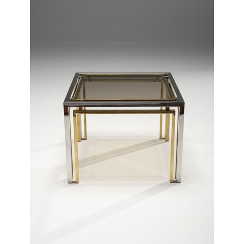 A champion of the Hollywood Regency style, Romeo Rega designs in a way that expresses wealth and power. This explains his choice of brass and chrome for the table's frame, an obvious reference to gold and silver, which he then topped off with smoked glass.