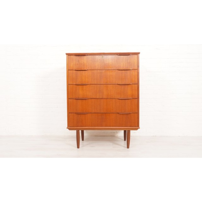 Beautiful vintage chest of drawers from Denmark. This cupboard offers plenty of storage space and stands out with its warm teak colour and the stylish, wooden handles on the drawers. A timeless cabinet that can find a nice spot anywhere in the house. The chest of drawers has 5 beautiful high drawers, so it can hold a lot more.