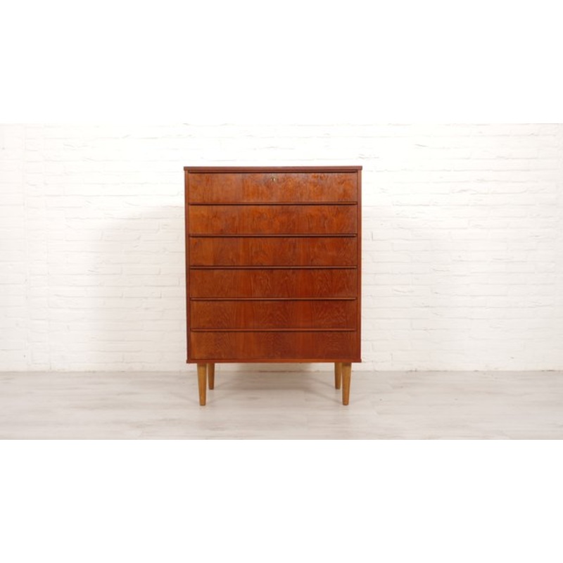 This vintage chest of drawers from Denmark has a classic design and gorgeous finish. The warm colour of the teak wood and stylish handles give the cabinet a unique look. with 6 drawers, it offers plenty of practical storage space. The top drawer can be loc