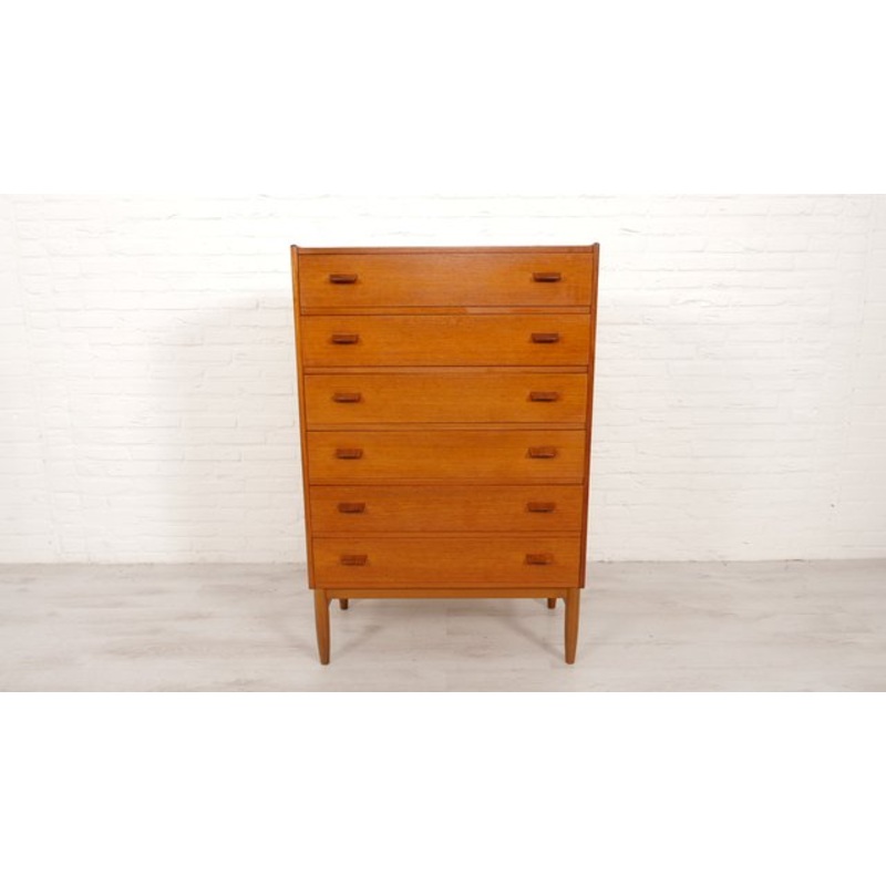 This vintage chest of drawers comes from Denmark and was designed by Poul Volther for Munch Mbler. The chest of drawers has 6 drawers, providing plenty of storage space. The chest of drawers features beautiful handles and an oak base.