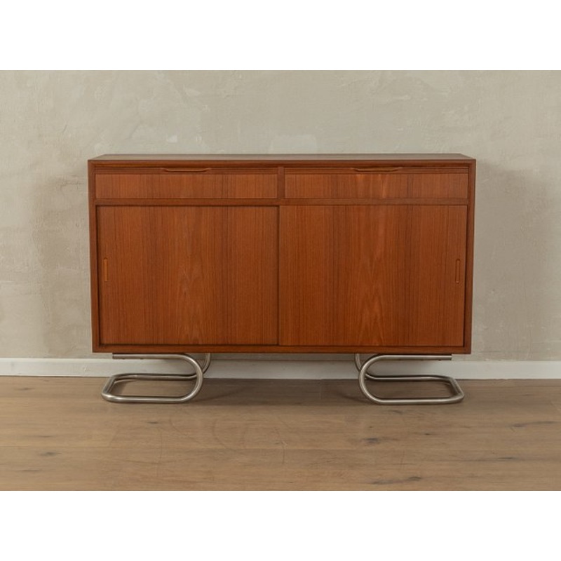 Classic chest of drawers from the 1960s. High-quality body in teak veneer with two sliding doors, two drawers, a shelf and new stainless steel feet in Bauhaus design.Quality features:very good workmanshiphigh quality materialsgalvanized solid wood drawersM