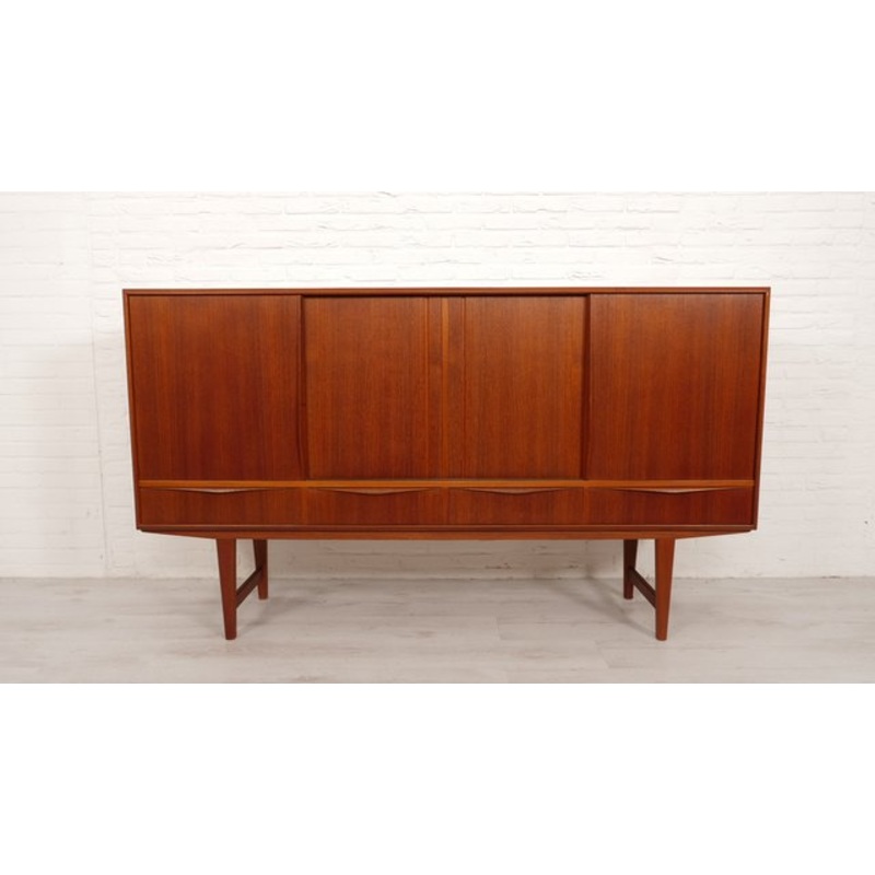 This vintage highboard is a perfect addition to your mid-century interior. This cabinet was designed by E.W. Bach in the 1960s. The cabinet is made of teak and stands out for its sleek timeless design. The cabinet offers plenty of storage space behind the 4 sliding doors and drawers. Behind the first three sliding doors you will find shelves. Behind the right sliding door you will find a mirror and 2 small drawers. At the bottom you will find 4 small drawers. The cabinet is perfect as a vintage crockery cupboard or sideboard.