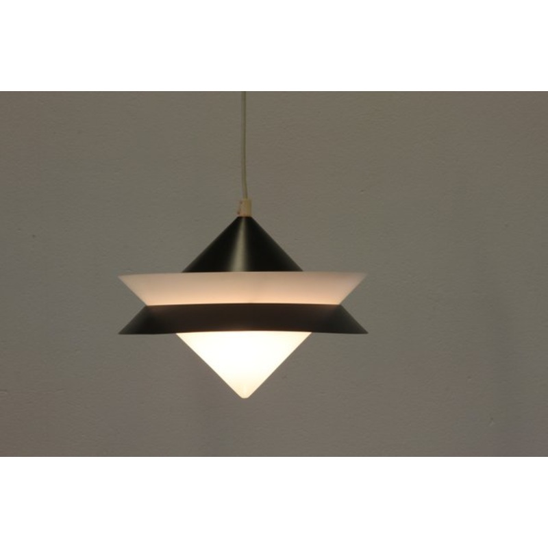 The lamp is made from lacquered metal, with a cone-shaped perspex piece in white. Mid century modern piece. Gives a natural and soft light.