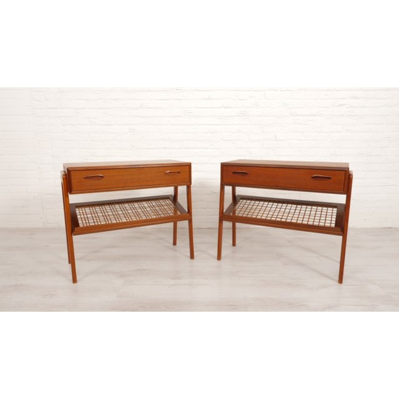 Super beautiful and rare set of side tables was designed by Poul M. Jessen in Denemearken. This vintage cabinet has a beautiful design, just look at the V-shaped legs and the handles of the drawers. The rattan shelf completes the vintage side table. These vintage side tables are also very nice to use as bedside tables.