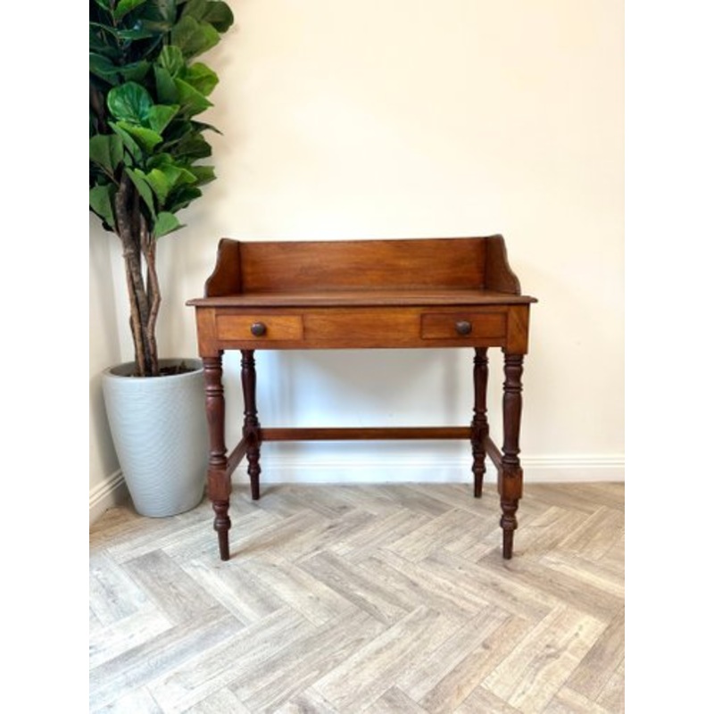 Solid wooden vanity unit with two small dovetail drawers. This is a vintage piece and does show signs of a previous life. DimensionsH: 74cmH (including back): 91cmW: 90cmD: 47cm Design Period 1980 to 1989 Production Period Unknown Style Mid-Century Detaile