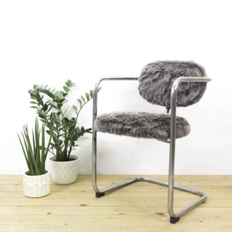 1970s chairs with chrome metal frame and upholstered with grey faux fur fabric.