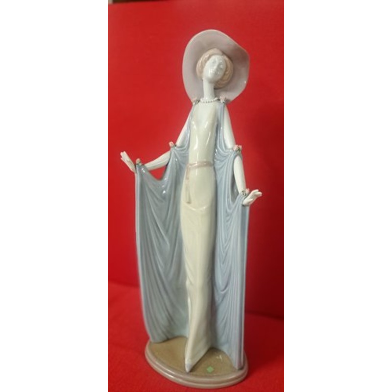 Porcelain figure from the Lladr company created in 1983 by Jos Puche. It was made from 1983 to 1998. Titled "Lady of Monte Carlo", it represents a delicate woman in a long dress and cape, carrying rosebuds and a wide hat. In soft ivory, blue and mauve tone
