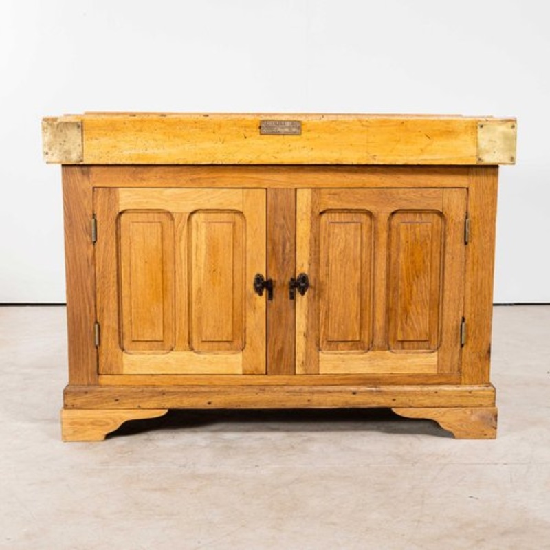 : 1950’s French Butchers Cabinet with Butchers Block Top. Brilliant practical kitchen cabinet with two doors and heavy duty end grain butchers block top. Original throughout with original brass corner brackets and original handles. Made from solid beech with panelled doors by Ferdinand Mols, Berchem Belgium. Our workshop has serviced the cabinet and the doors close properly. Cupboard Shelf: L65 W110 H28 (cm) Date:1950’s Maker:Handmade – Belgium Dimensions:120cm(w) x 73cm(l) x 88cm(h)