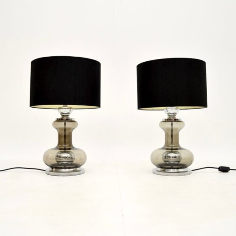 A stylish and very well made pair of vintage French glass and chrome table lamps, dating from around the 1970s.