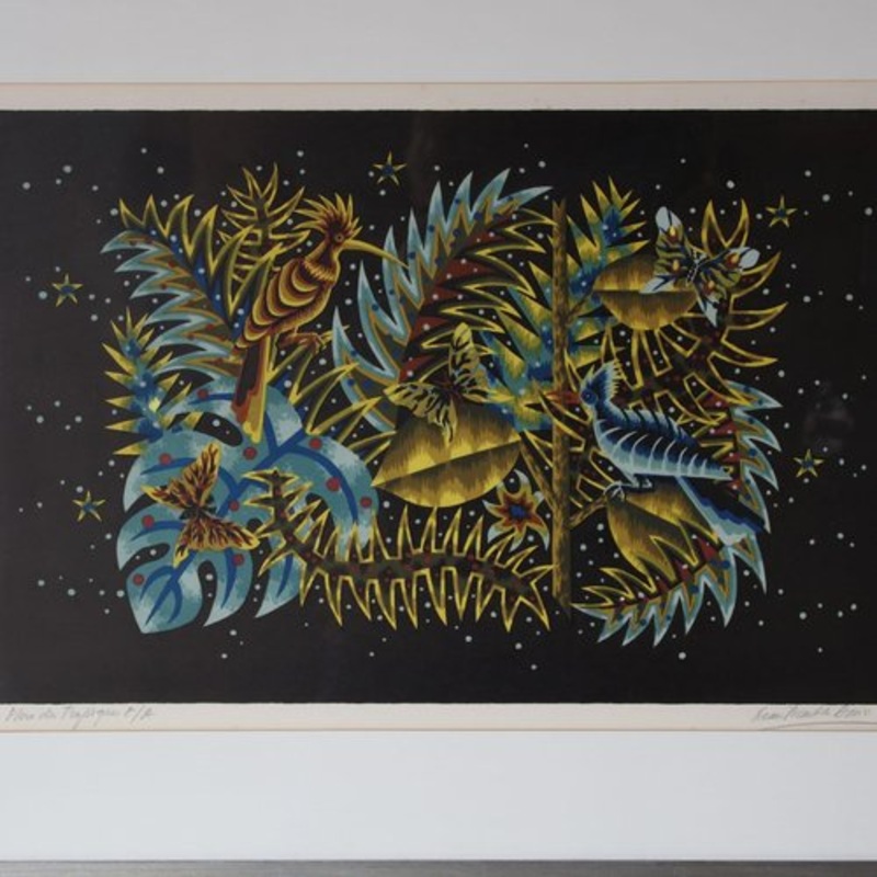 A fantastic lithography, Flore de Tropique, made by Jean Picart Le Doux in 1955 in France. The beautiful art presents tropical flowers and birds in beautiful bright colours, wonderfully contrasting against the black background. Framed in a white pass partout frame to emphasize this contrast, the piece overall is just a fantastically appealing artwork! Hand signed in pencil to the underside, which makes this an even more impressive find. It remains in very good vintage condition with minor wear consistent with age and use, preserving a wonderful patina.