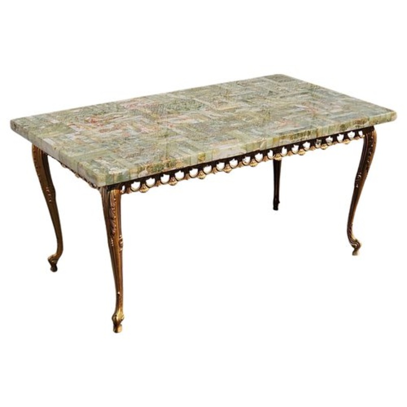 French Vintage green Onyx Marble and Brass Coffee Table – Cocktail Table from the 70s Exquisite Marble table top with natural patterns and wonderful play of Colors in emerald, jade, mother of pearl, brown and orange. Golden Brass Frame lavishly decorated with Louis XV Style motifs and slightly curved Cabriole Legs. A sophisticated and distinctive addition to your Living Space. In very nice vintage condition – bears slight signs of age, such as minor scratches on the tabletop’s coating and the edges – refer to pictures. Dimensions: Height: 43 cm / 16.93 inches Width: 90 cm / 35.43 inches Depth: 50 cm / 19.69 inches