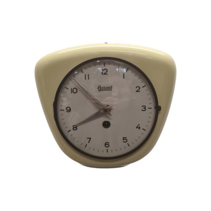 Vintage wall clock by Garant, from the 50s/60s. Beautiful vintage wall clock made by the Garant company from Germany. The case is made of ceramic in a light yellow color and a glass window. Complete with key and runs well.Dimensions:22 5 20 cm (L x W x H)