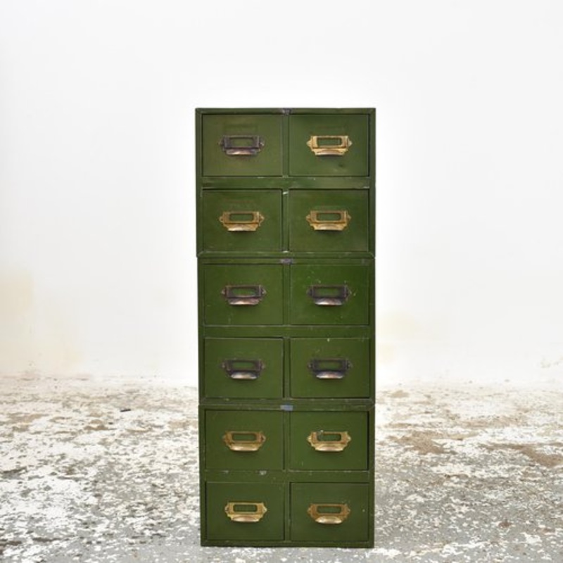 Vintage Green Metal Pilot Index Filing Drawers A great set of original mid century filing drawers with their original brass label holders.This is sold as a stack of 3 separate four drawer units stacked on top of each other (see main photo). Alternatively the three sets of four drawers can be used separately as an individual four drawer unit so lots of ways they could be used one could be on a desk for files and an other two stacked on top of each other as a side table or filing cabinet. Dimensions: 3 x stacks of four filing drawer units: Height: 93cm Width: 37cm Depth: 39cm 1 x stack of four filing drawers: Height: 31cm Width: 37cm Depth: 39cm Origin: Made by Pilot, UK Circa: 1960s Workshop Report: The drawers have aged related marks, scratches to the metal work from wear and tear see photos.