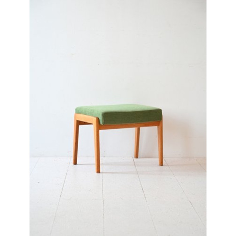 Scandinavian 60s pouf with oak wood structure and padded seat lined with green fabric.