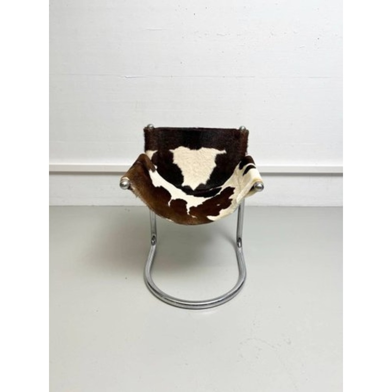Vintage hairdresser's chair, cowhide cover This vintage hairdresser chair impresses with its classic design and high-quality workmanship that combines both comfort and functionality. It has a generous, padded seat and backrest covered with durable cowhide.