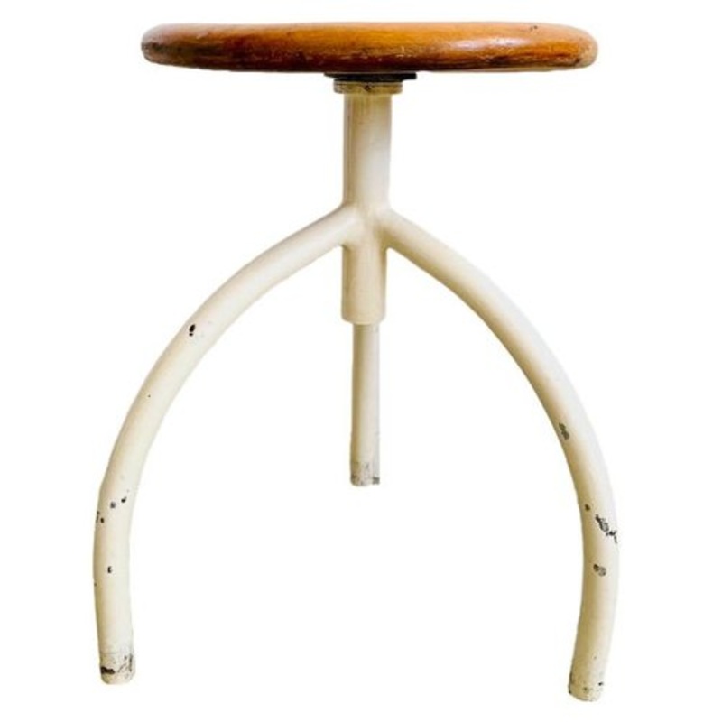 Iron and wooden vintage industrial stool from the 1950s with original patina and height-adjustable. The stool was designed by Cor Alons for Oostwoud Franeker in the 1950s. This stool is a great Dutch design product and is included in the TU Delft collection. This stool has a metal base and a beautiful lived-in solid wooden seat. In the photo the stool is 49.5 cm high. The seat has a diameter of 34 cm. The widest point at the bottom is 39.5 cm. The maximum height is 58 cm and the minimum height is 44 cm.