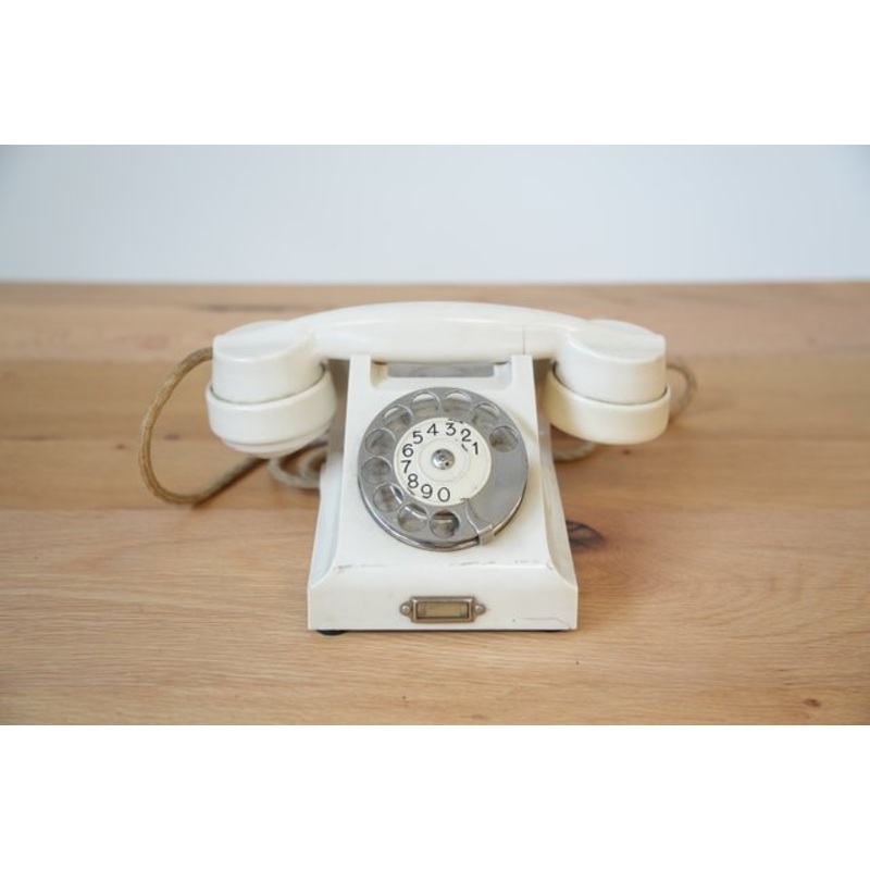Vintage 1940s Ericsson Bakelite Rotary Phone Industrial DesignAuthentic Ericsson rotary phone from the 1940s-1950s, crafted from white Bakelite with a sleek, industrial design. This mid-century telephone features a metal dial with black numbers, an origina