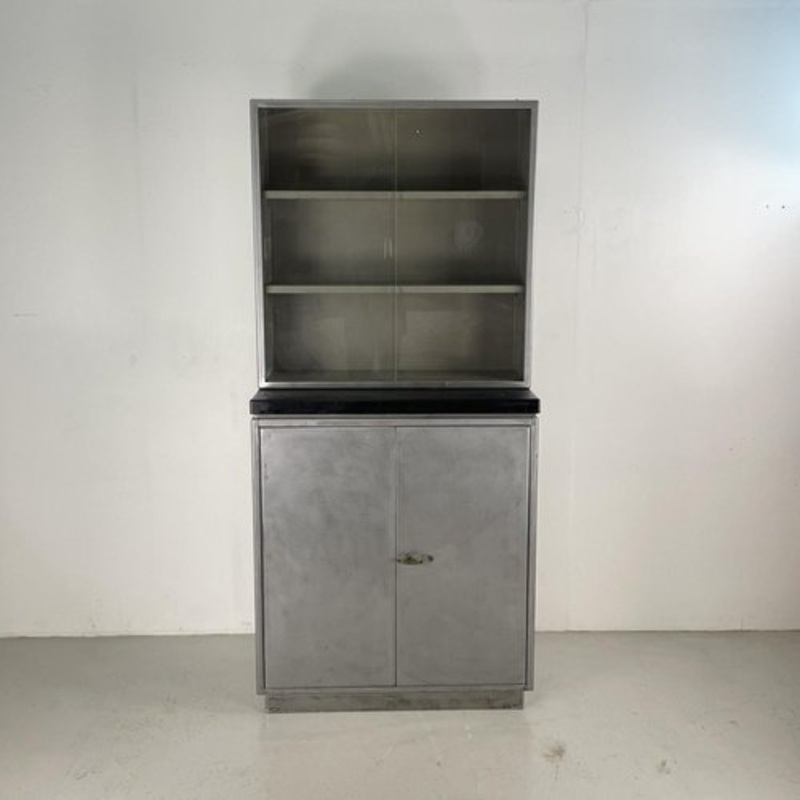 Polished metal display cabinet / bookcase with sliging glass doors and adjustable shelves. In good condition, with some knocks and scuffs commensurate with age. Approximate dimensions: Height: 199.5cm Width: 92cm Depth: 46cm. Top section (adjustable shelves) Height: 88cm Width: 85cm Depth: 22.5cm Bottom section (adjustable shelves) Height: 84cm Width: 91cm Depth: 41.5cm. Always extremely popular and hard to get hold of, this is a great industrial piece.