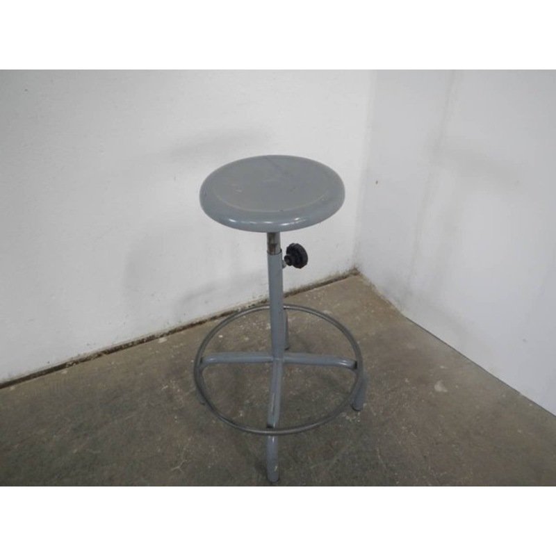 Light wear consistent with age and use, Patina consistent with age and use, la seduta presenta due fori come da foto.A 4 gambe. La seduta misura cm 30 di diametro. Regolabile manualmente da cm 77 a cm 60