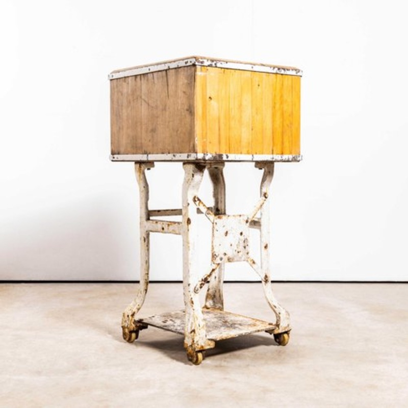 : 1960’s Italian Butchers Block By Joko – with Cast Base. Unusual and very interesting mobile butchers block. The base is made with cast metal legs bolted to a solid steel base and various supports. The butchers block is solid hornbeam in excellent condition, the block retains its’ original working but stiff wheels. The base has been overpainted many times and we love the character so we have left it as is. A stunning and unusual piece. Our workshop has gently cleaned it but is is good to go. The block is stable but very heavy so please bear this in mind for daily use. Workshop Report: Our workshop team inspect every product and carry out any needed repairs to ensure that everything leaves us serviced and maintained ready for many more years of life. All of our vintage products show the rich beauty and history of their life with the knocks and bumps of many years of use and we try to minimise restoration to keep every piece as original as possible. Date:1960’s Maker:Handmade Italy Dimensions:51cm(w) x 51cm(l) x 103cm(h)