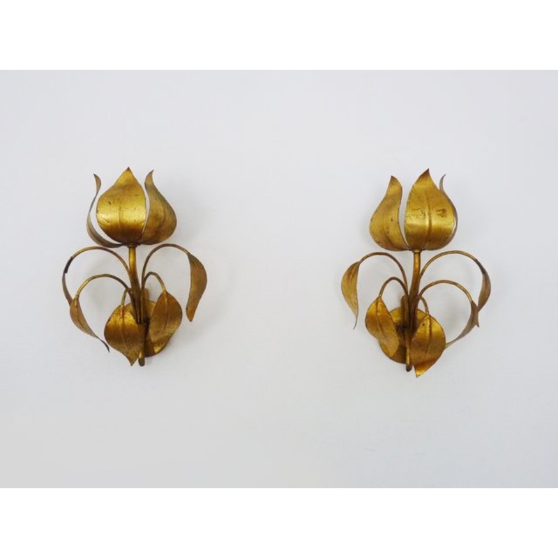 Pair of vintage Italian stylized foliage wall lights with gold leaf. 70s 80sMagnificent pair of Italian Stilnovo style wall lights in gilded metal with gold leafFoliage decoration with 3 leaves at the top from which the light comes out They will be magnifi