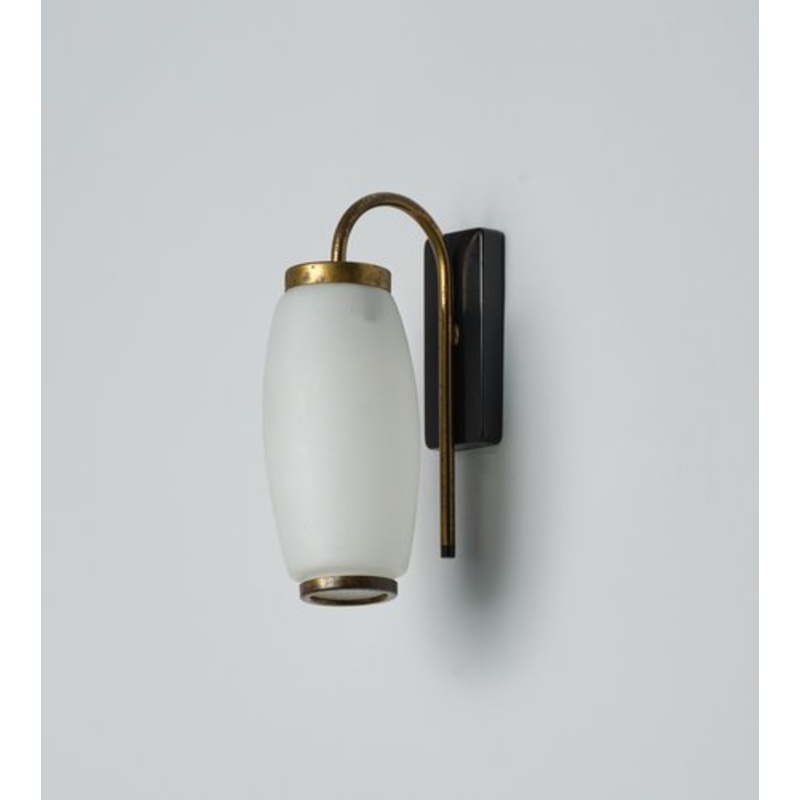 Presenting one vintage Italian wall lamp. Crafted in the 1950s, these elegant appliques feature a combination of brass, black lacquered metal, and opaline glass, showcasing authentic design from the era. The brass boasts its original patina, while the black lacquer adds character with charming signs of age. Compatible with standard E14 bulbs, these lamp is fully functional and suitable for use in the United States.