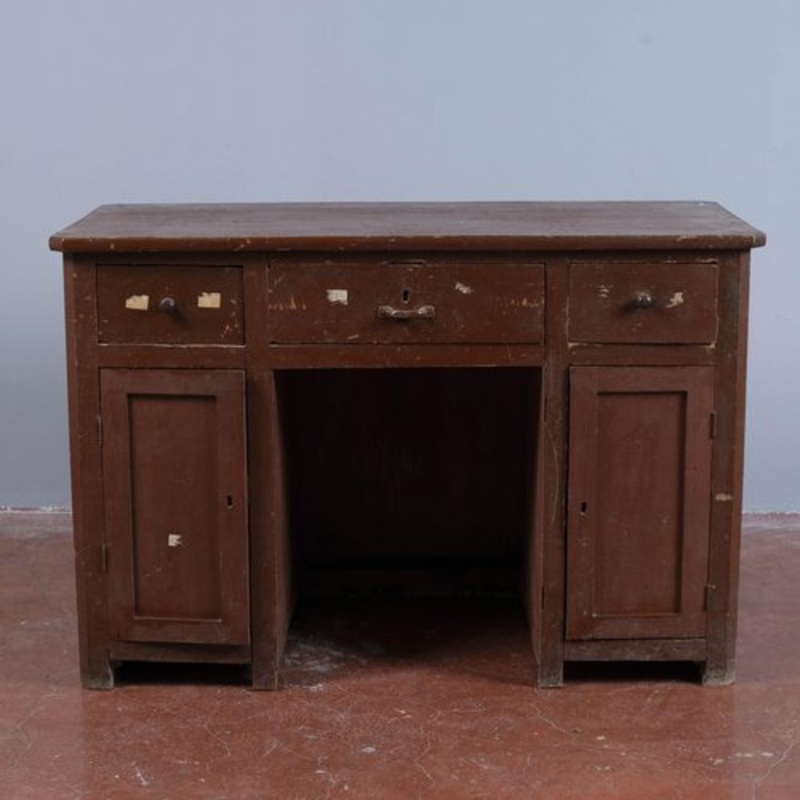 Ancient desk in lacquered solid fir wood to be completely restored, missing frame-plinth on the lower part of the furniture. Measurements 129 x 63 x h 83 cm CATEGORY 900 STYLE desks DIMENSIONS: HEIGHT 83 cm WIDTH 129 cm DEPTH 63 cm COLOUR: brown MATERIAL: wood CONDITION: Worn, the vintage object has missing parts and/or defects and may need repairs