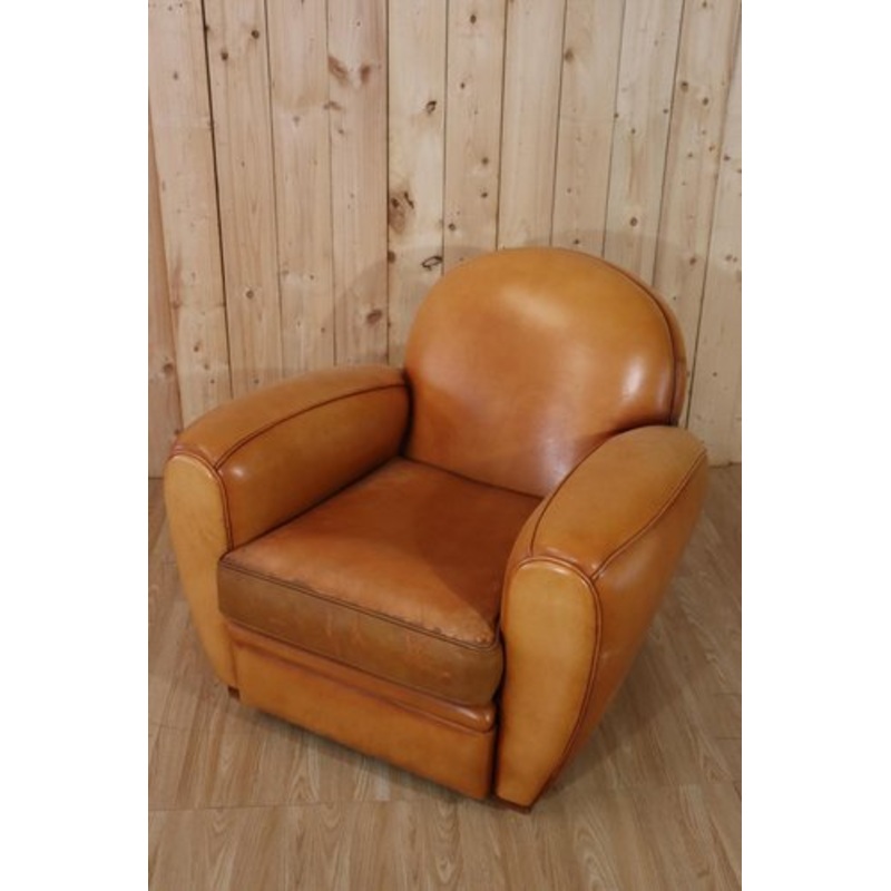 Club armchair entirely in leather, rounded in shape. Light brown in color. The backrest is said to be low, round in shape as are the armrests. The seat and armrests still have good firmness. Vintage 1980/90. Traces of time and previous use. Seat height 44c