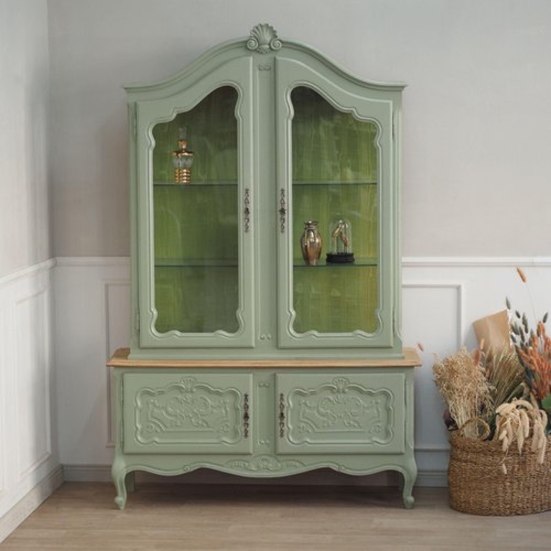 Elegant display cabinet, patinated in mint green in combination with a natural middle plate. The curved shape, artistic carvings and soft colors make them a unique eye-catcher. Behind the glass doors, two glass shelves provide storage space. The covered interior rear wall and the side glazing complete the stylish overall picture. An absolute eye-catcher! Material: Solid wood with glass inserts, carved details and metal fittings Dimensions (in cm): H 191 / W 124 / D 42 Features: Delicate green surface with elaborate decorations in combination with natural wood Spacious interior with wide-opening curved glass doors and side glazing Decorative fabric cladding inside Perfect as a stylish display case for crockery, collectibles or decoration, ideal for living or dining rooms Condition: Very good, refurbished and redesigned, age-related signs of wear