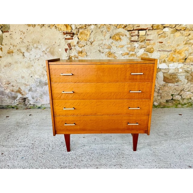 Beautiful, vintage, Scandinavian- style chest of drawers on spindle legs, circa 1970's. The piece is made of wood, with a golden-oak colored veneer finish. It has 4 drawers, all functional and clean, and have their 8,original, brass and bakelite handles (s