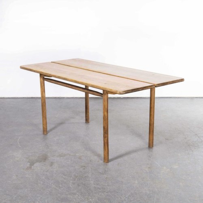 : 1950’s Oak Rectangular Dining Table By Pierre Gautier-Delaye. Pierre Gautier-Delaye was an important mid century designer in France, trained at the Paris School of Decorative Arts. Delaye initially started work as a draughtsman, then joined the interior design department of Raymond Loewy’s studio before starting his own firm in Faubourg St Honor Street, Paris. Made from solid oak, the table shows the refined attention to detail and the focus of Delaye on pure materials. The top is made from solid oak planks which are split into two pieces with a central opening. The round legs are supported by turned sub rails which are notched into the legs. The legs are joined into the top with simple round tenon joints, the sub frame is a strong structure. Beautiful mid century French design. The table came from a college in France and we show it in the form we purchased it, the table has the knocks of daily use but the appeal is the worn and bleached out colour which we have retailed without resorting to over waxing or restoration. Knee height clearance 60cm. Date:1950’s Maker:Handmade France Dimensions:80cm(w) x 160cm(l) x 72cm(h)