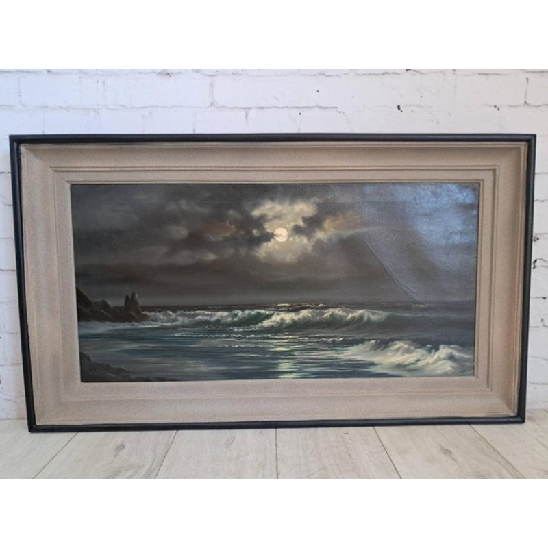 Arnold Beardsley Large Moonlit Seascape Oil Painting Framed & Signed 1960’s A captivating masterpiece by the renowned artist Arnold Beardsley, this exquisite oil painting captures the ethereal beauty of a moonlit seascape. The luminous full moon pierces through dramatic storm clouds, casting a silvery glow across rolling waves, while the rugged coastline adds depth and intrigue to the composition. Executed with masterful brushwork, this large-scale artwork evokes a sense of tranquillity and grandeur, making it an exceptional centrepiece for a distinguished interior. Encased in its original vintage frame with soft metallic hues, the painting harmonises classical elegance with atmospheric drama. A rare find, this signed Beardsley seascape is perfect for collectors of fine art and those seeking to elevate their space with timeless sophistication. Dimensions: Including Frame: 97cm L x 56cm H x 4cm D Actual canvas: 80cm L x 40cm H Medium: Oil on canvas Condition: Excellent vintage condition For those who appreciate fine art, this breath taking seascape is a true investment in beauty and craftsmanship.