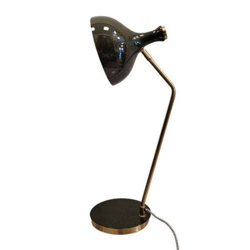 Exceptional table or desk lamp, Olive model. Made of iron, this lamp combines satin green and matte gold on the inside of the lampshade and the base to create a unique and elegant design, totally timeless, ideal for adding style to your desk and in full current trend. The golden color of the interior causes the light emitted by the lamp to be warm, creating a cozy atmosphere. The cable is covered with a braid combining white and black. Good condition for its age and use.