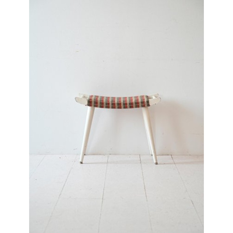Original 1960s Scandinavian footstool with white painted wooden structure and seat with checked fabric.
