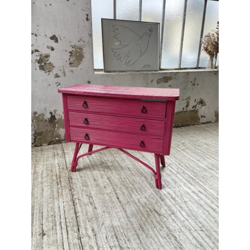 Old small rattan chest of drawers from the 60s patinated in fuchsia pink.We love its small size, the general design created by the rattan, its tapered base and the drawers topped with black forged metal handles.The chest of drawers was painted by its previ