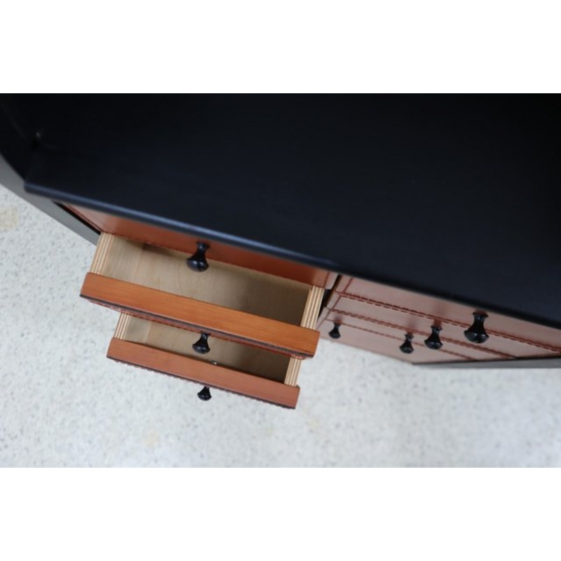 Nice and versatile vintage roller shutter cabinet by Giorgetti 1980s. It is made of plywood covered by matte black laminate structure, it has upper compartment with shutter door and internal drawers. The front drawers and doors are covered by brown leather
