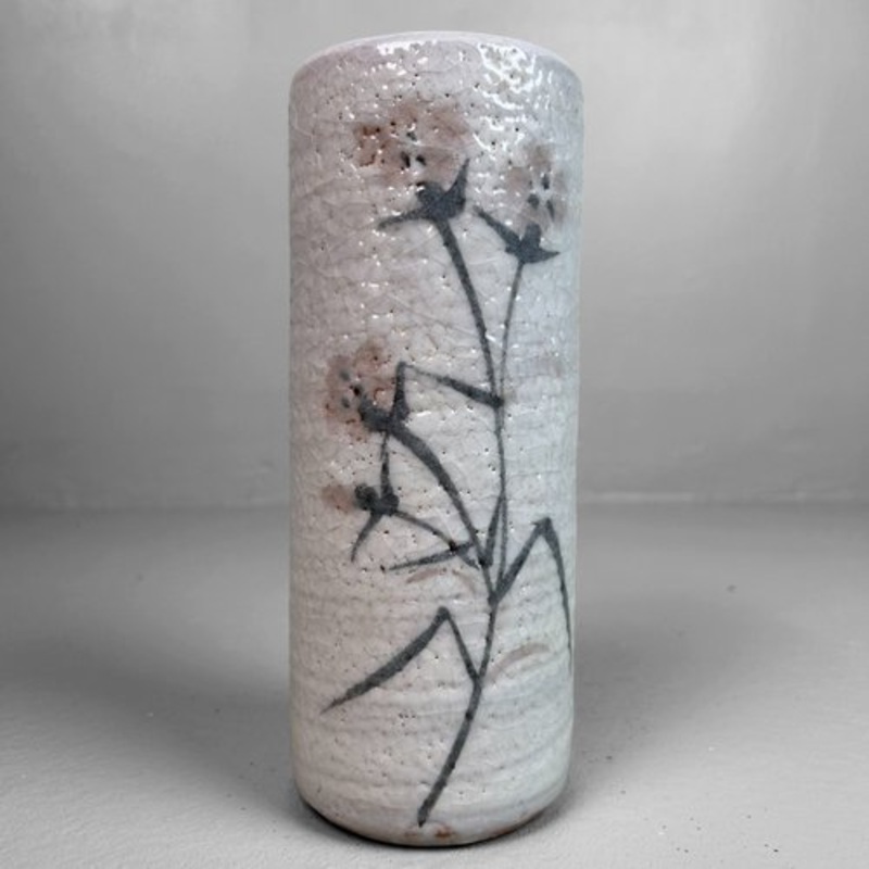 This elegant cylinder vase is a stunning example of traditional Shino pottery, known for its warm, organic shapes and unique crackle glaze.