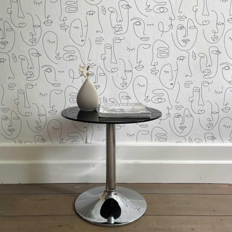 Vintage side table with black glass top and silver-colored metal base. The top has some scratches. 50 h x 50 cm