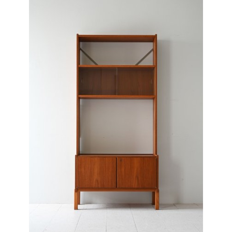 Teak bookcase, vintage design. Equipped with open shelves and a lower compartment closed with doors.