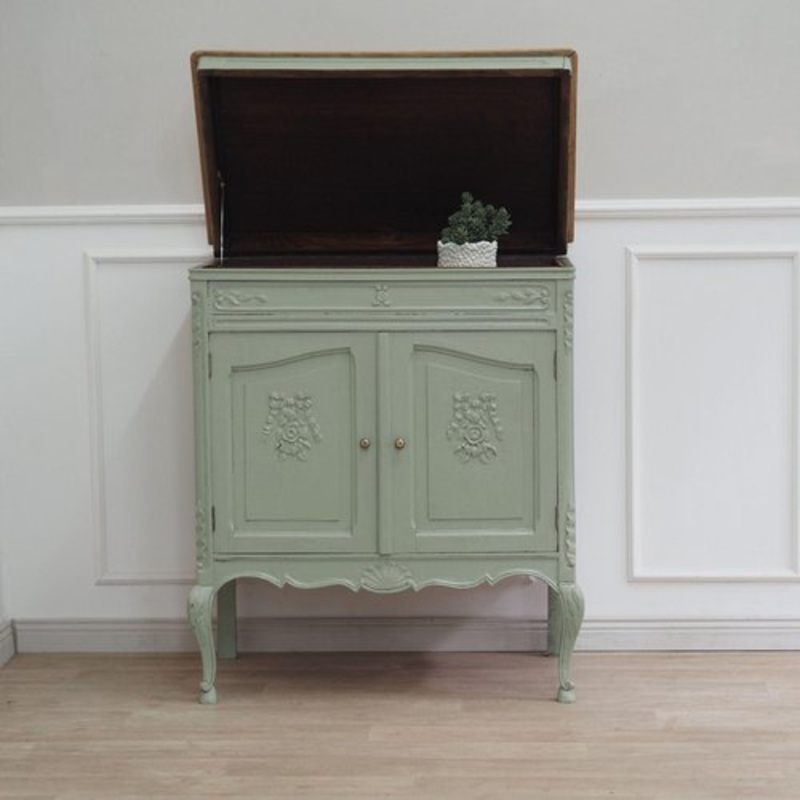 This elegant sideboard / antique chest of drawers impresses with its hinged lid, curved lines and delicate carvings. The Louis XV style with a redesigned combination of soft green tone and natural wood panel is unique. In addition to the “secret compartment”, 2 lower doors provide additional storage space. A stylish piece of furniture, which, after processing, can be found in a new mint green color scheme and fits perfectly into modern country house combinations, for example. Material: Oak wood with decorative carvings, brass buttons and natural wooden top Dimensions (in cm): H 90-127 / W 77 / D 51 Function: Previously used as a linen cupboard or storage cupboard, now ideal as a stylish storage solution for living rooms, bedrooms or bathrooms. Features: Delicate green surface with elaborate decorations in combination with natural wood Secret compartment – The opening function of the lid is not visible from the outside Delicate floral carvings on the doors and elegantly curved legs Condition: Very good, refurbished and redesigned, age-related signs of wear