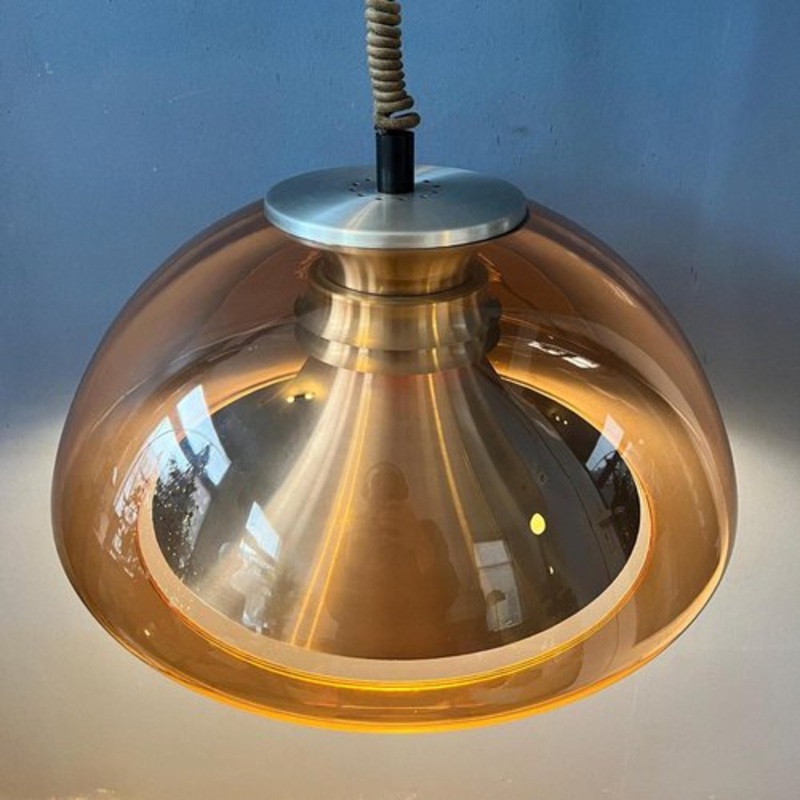 Large space age pendant lamp by Herda with double shade. The lamp consists of a transparent, dark copper-coloured shade and aluminium inner shader. The lamp requires one E27 (standard) lightbulb and is currently hardwired. [Condition] Very good. The outer shade has some vague scratches, see last picture. [Dimensions] Shade: 50 cm Height (Shade): 26 cm.